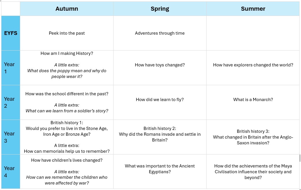 We aim to ignite curiosity. From Reception to Year 4, children build their knowledge, skills and understanding step by step, developing a strong sense of chronology and a growing awareness of how civilisations, events and individuals have left lasting legacies. Through thoughtful questioning and enquiry, pupils learn to explore, analyse and think deeply about the past.